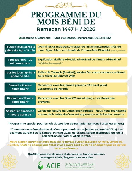 Programme du Ramadan 1447H / 2026 à la Mosquée A’Rahmane