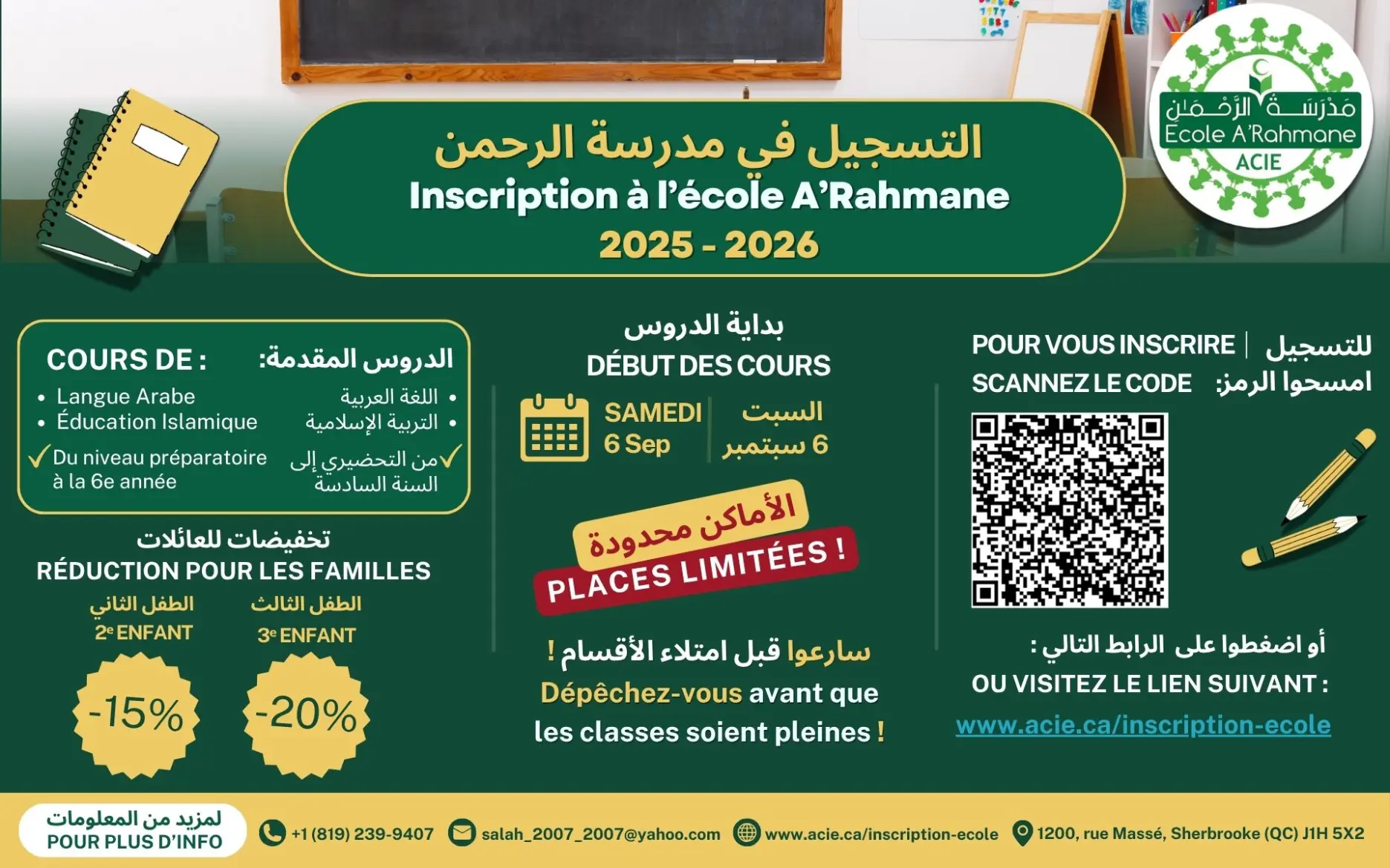 L’école A’Rahmane annonce l’ouverture des inscriptions pour l’année scolaire 2025-2026.